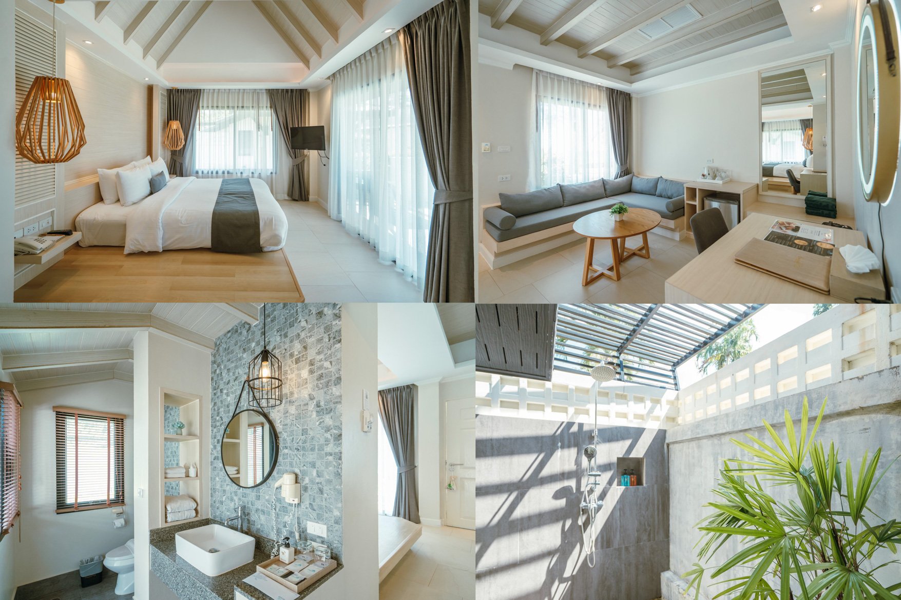 ห้องพักกว้างและแบ่งโซนได้แบบน่ารักมากๆ มีทั้งมุมเตียงนอนที่ดูโล่งโปร่งสบายตา ห้องน้ำมีทั้งแบบอ่าง Indoor และ Rain Shower อยู่ Outdoor ธรรมชาติมาก