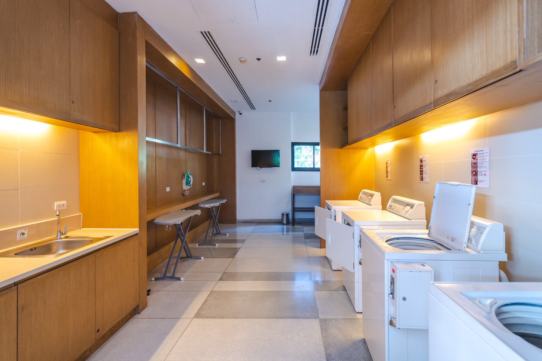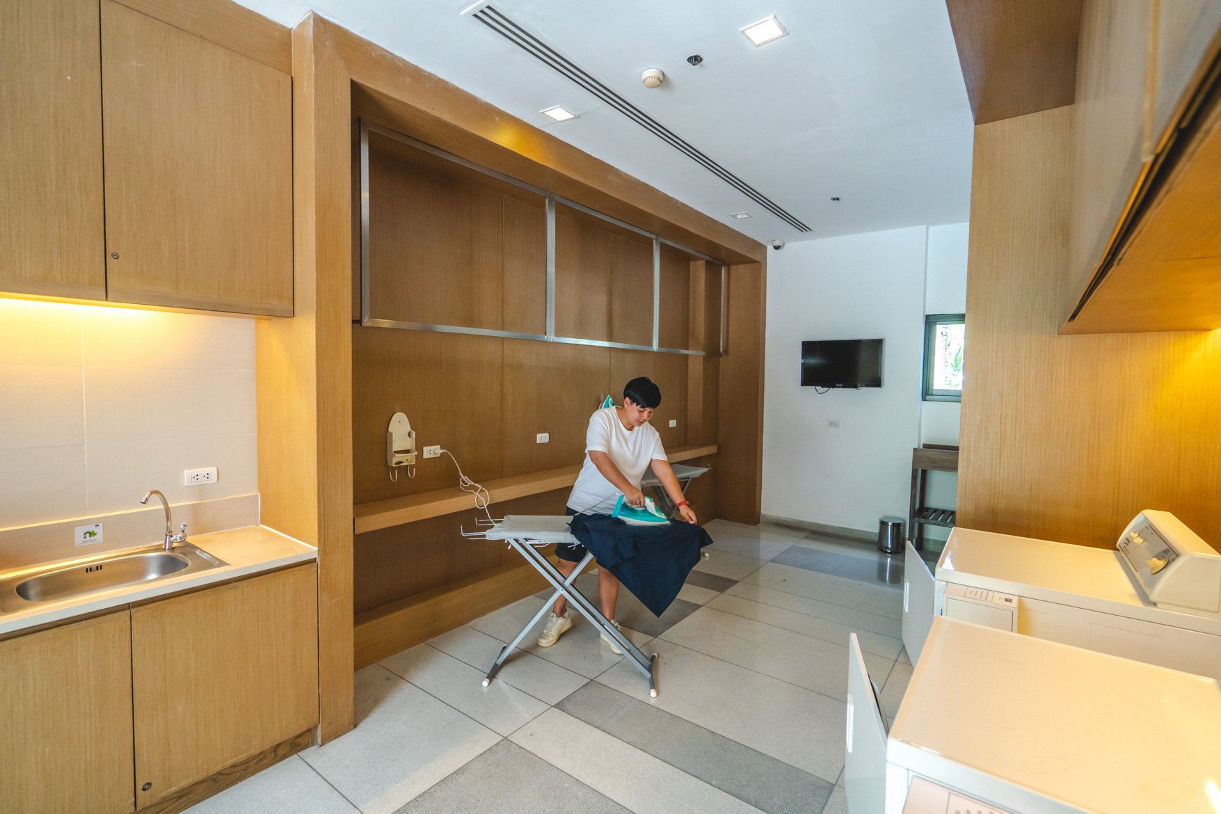 Laundry Room ห้องนี้ตอบโจทย์คนที่มาอยู่ระยะยาวมากๆ สามารถมาซักผ้า รีดผ้า โดยติดต่อทางล็อบบี้ได้เลยค่าบริการ 100 บ. จะมีน้ำยาซักผ้ามาให้ และถ้าต้องการอบผ้าด้วยจะมีค่าบริการอีก 100 บ. แต่จะเป็น self service น๊าาา ซักเอง รีดเองได้เลยค่าาา สะดวกมากๆ