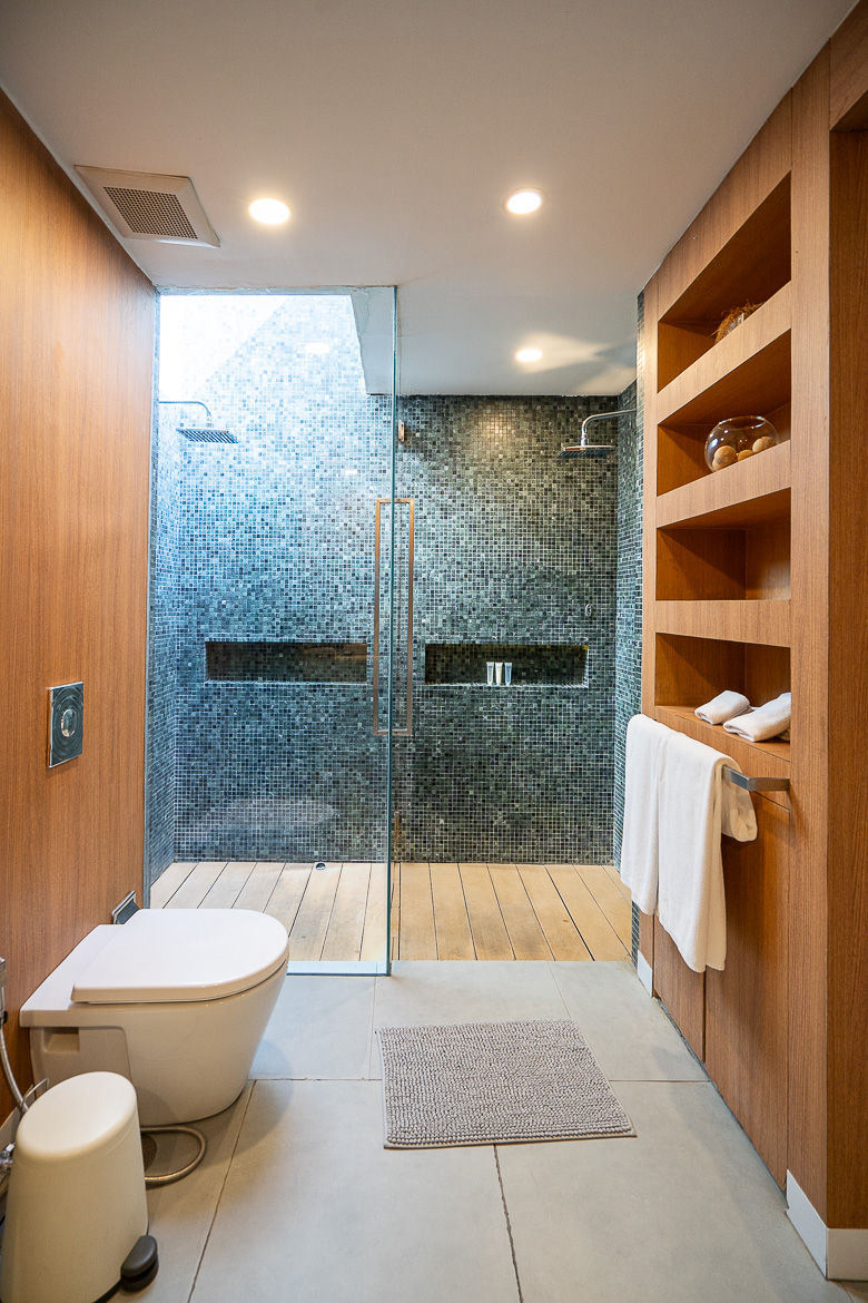เมื่อเดินมาทางอีกด้านของห้องจะเจอห้องน้ำใหญ่ๆ แบบนี้เลย มาพร้อมเครื่องอำนวยความสะดวกครบครัน มีกระจกบานใหญ่ ห้องอาบน้ำ 2 ห้อง บอกเลยว่ามา 2 คนไม่ต้องแย่งกันเข้าห้องน้ำเลยจ้า