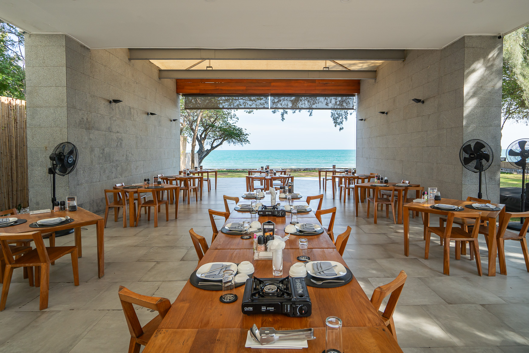 เดินออกจากห้องมาดูพื้นที่ส่วนกลางของที่นี่กันบ้าง ตรงนี้จะเป็นบริเวณห้องอาหารที่อยู่ติดทะเลเลย บรรยากาศดีมาก