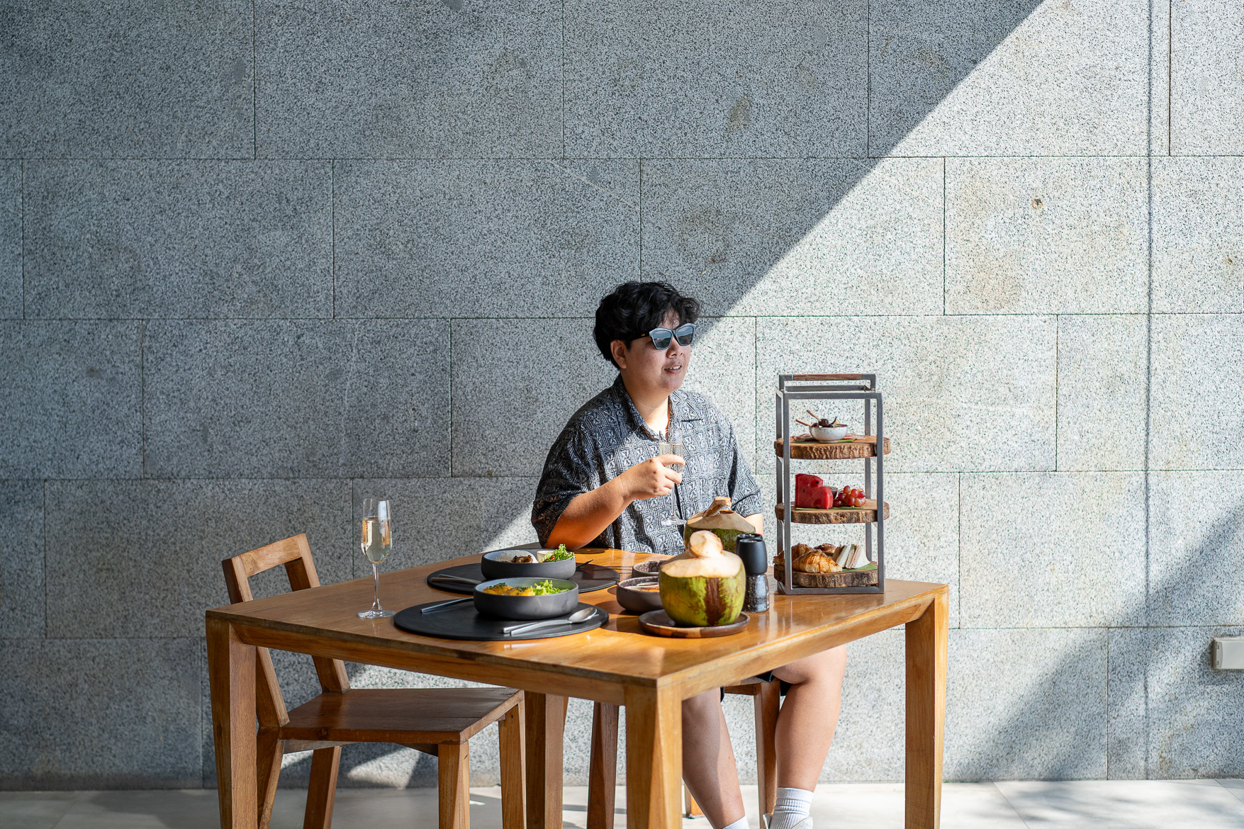 มุมสระว่ายน้ำตรงนี้ยังมีมุมโต๊ะสำหรับทานอาหารได้อีกด้วยน๊า เดี๋ยวช่วงเย็นเราจะสั่งเซ็ทชาบูมาทานที่นี่กัน