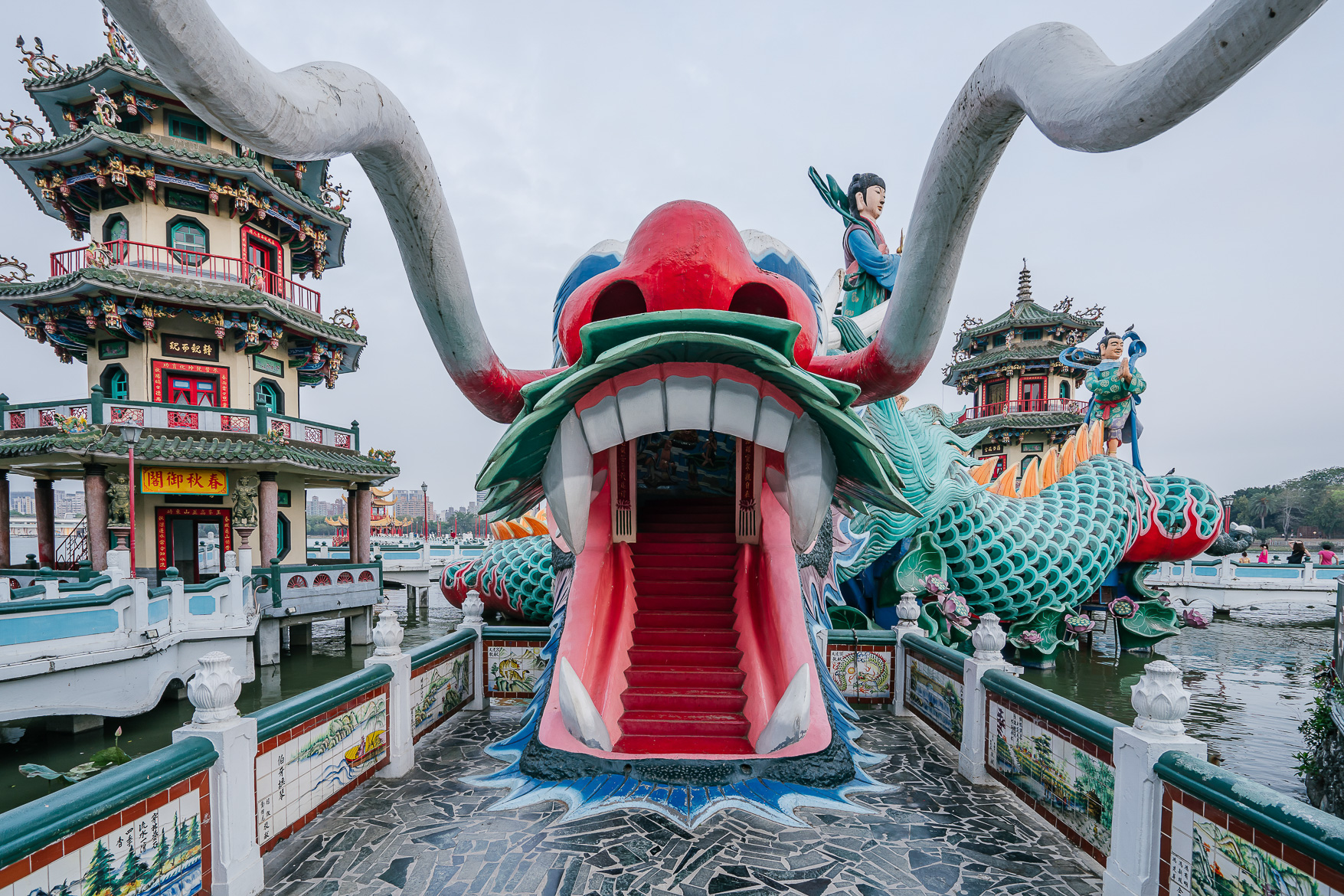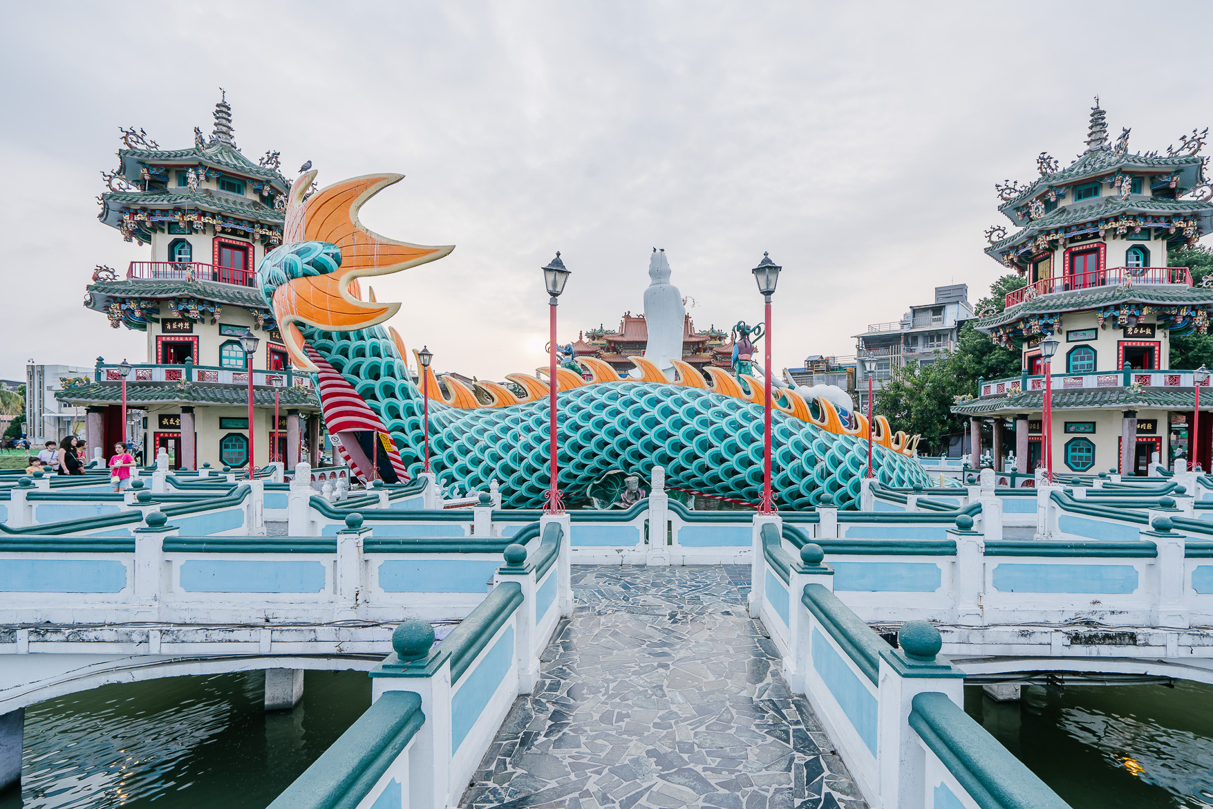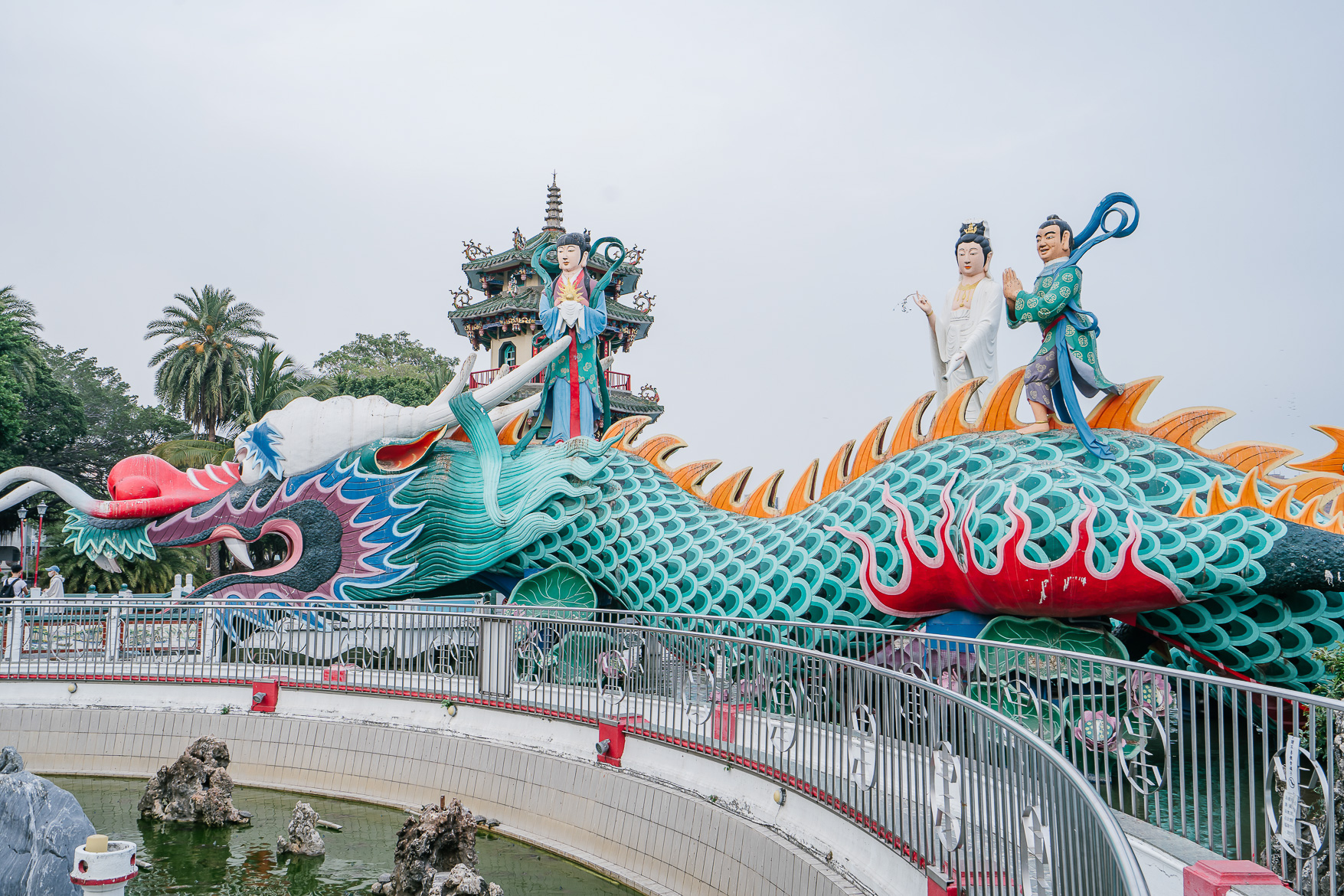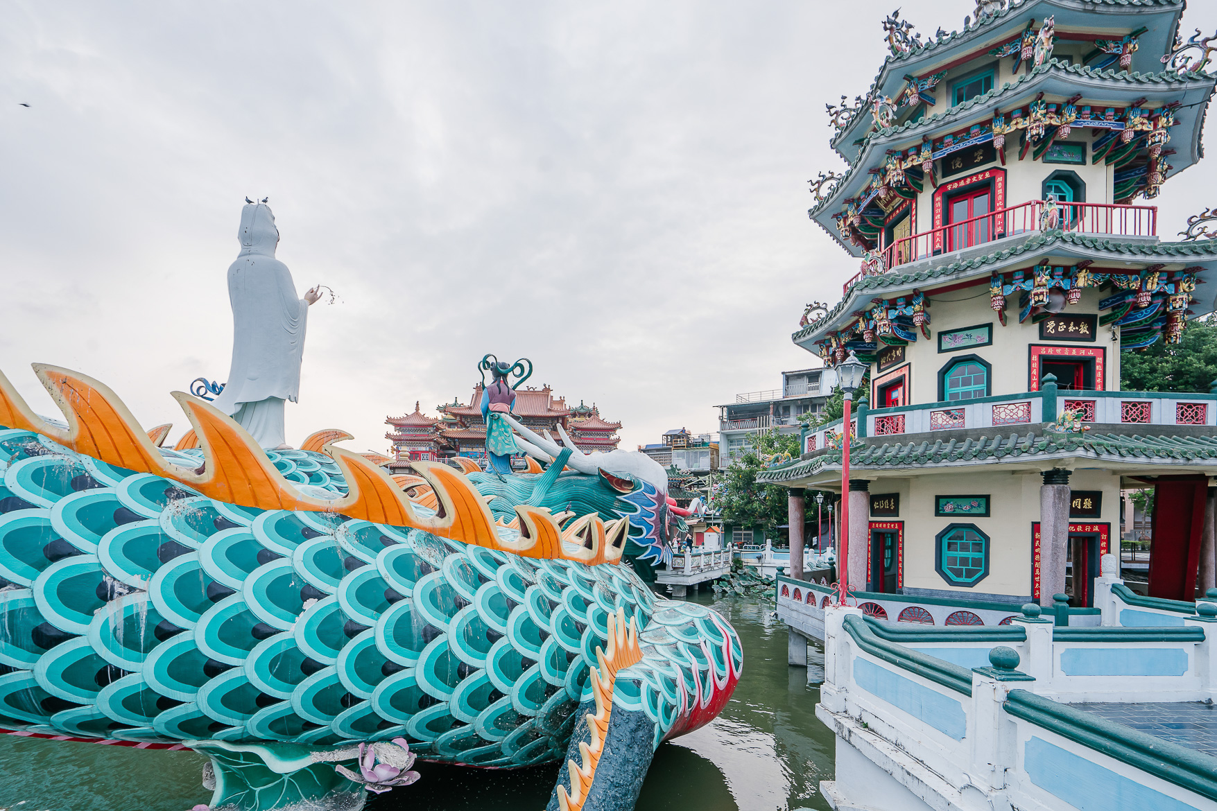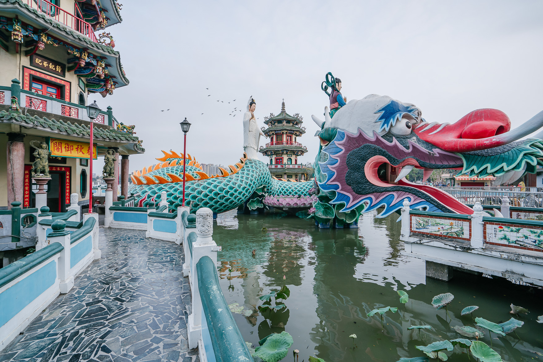 เมื่อเราเดินเข้ามาจะเห็นรูปปั้นพระแม่กวนอิมทรงบนหลังมังกรที่คดเคียวไปทั่วสระบัว สวยงามมาก