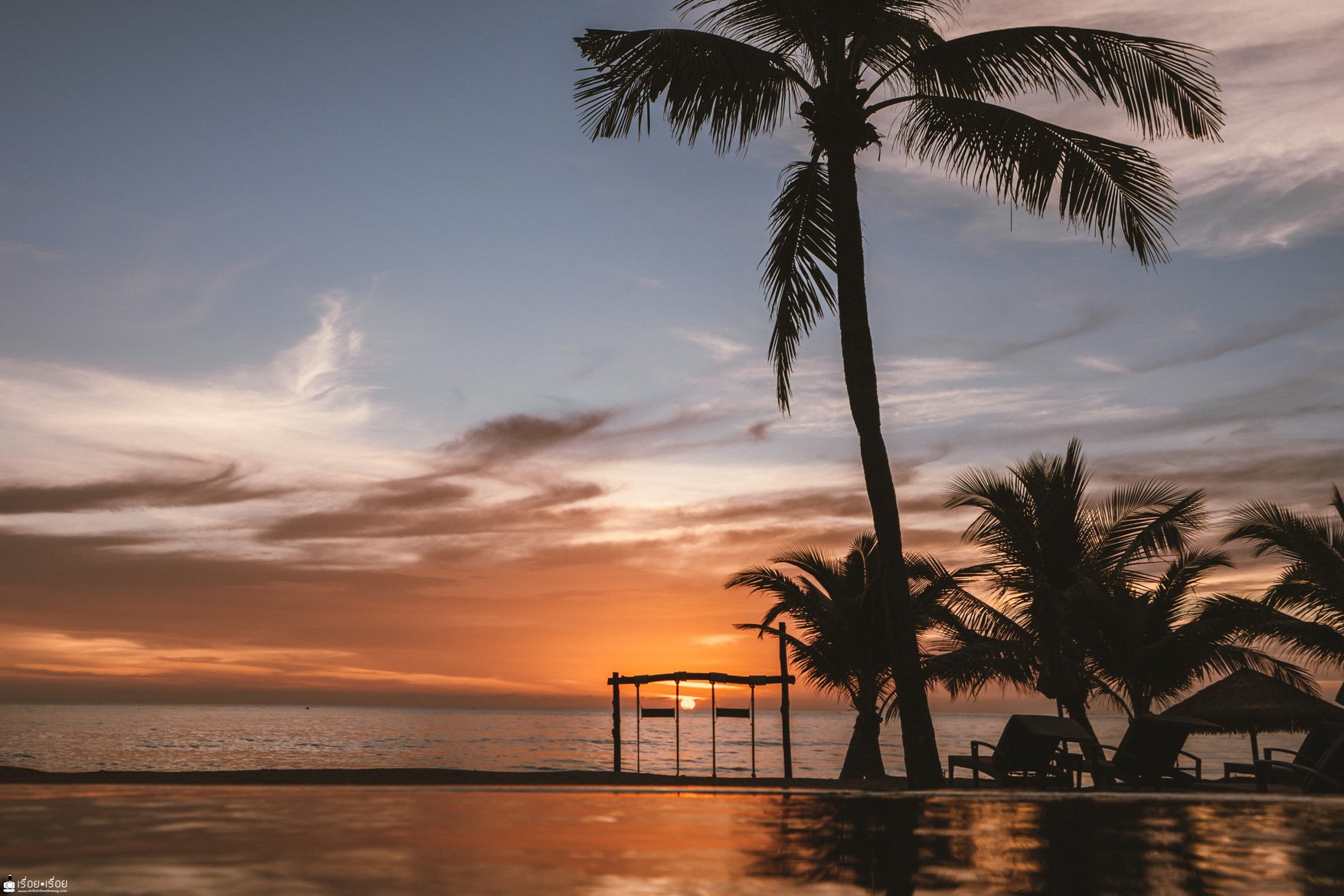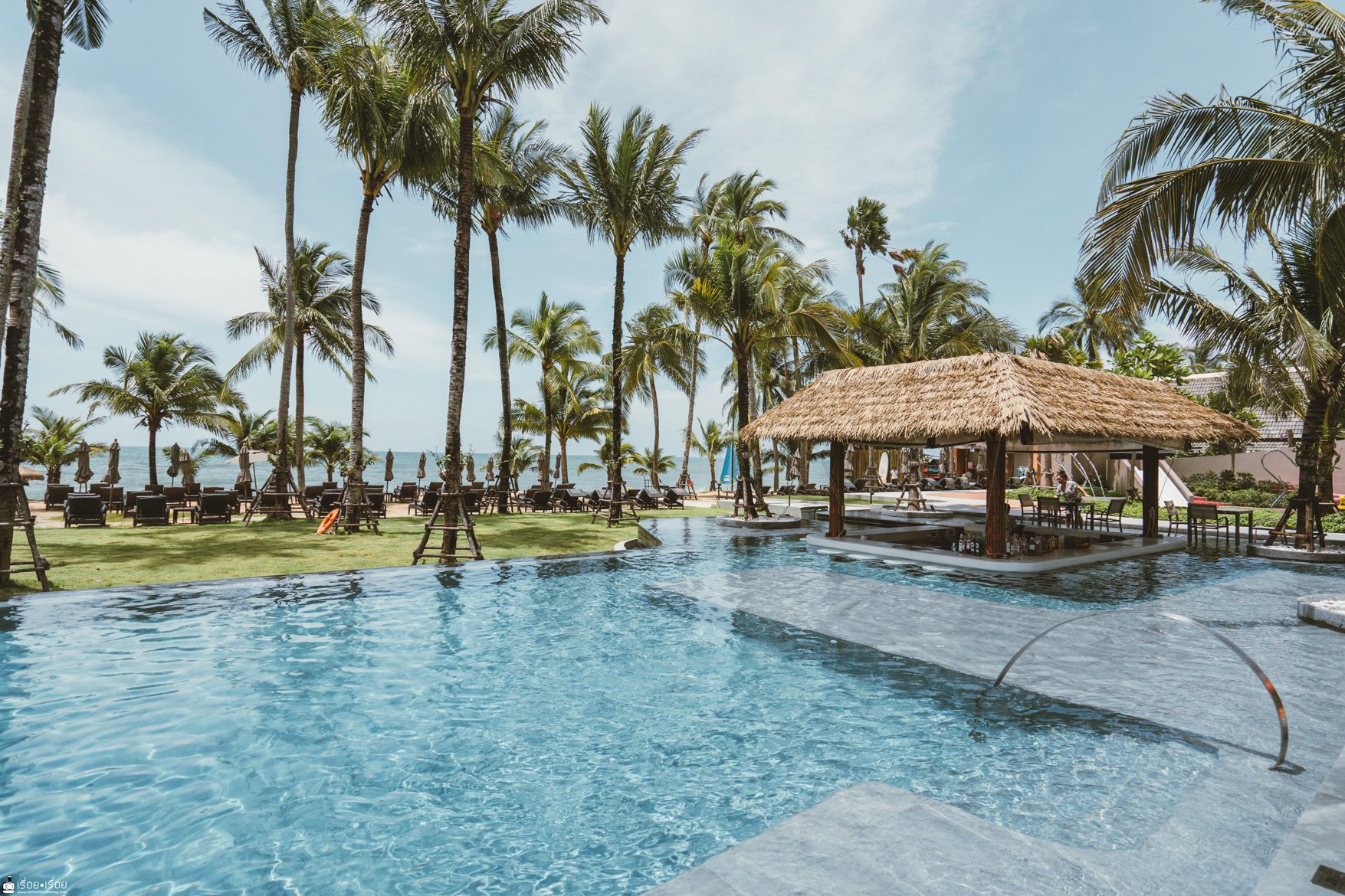 สระว่ายน้ำตรงหน้าหาดก็เป็นอีกหนึ่งไฮไลท์ของที่นี่นะคะ เพราะตอนเย็นพระอาทิตย์ตกมองตรงนี้คือสวยมาก แล้วก็มี Pool bar ด้วย
