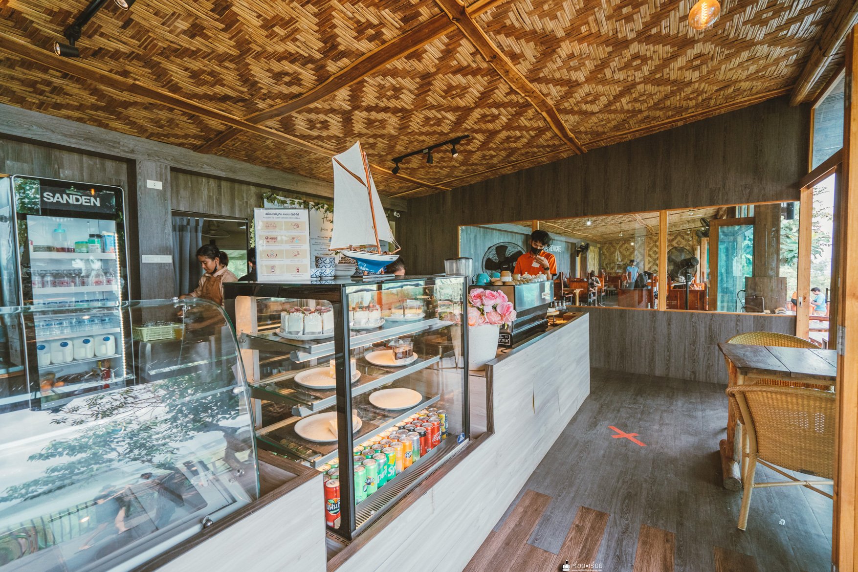 ที่ร้านมีบริการทั้งเครื่องดื่มและเค้ก สั่งน้ำไป 2 แก้ว เค้ก 1 ชิ้น ค่าเสียหายประมาณ 300 นิด ๆ นำตั๋วที่รถที่ซื้อมา มาเป็นส่วนลดได้ 30 บ.
