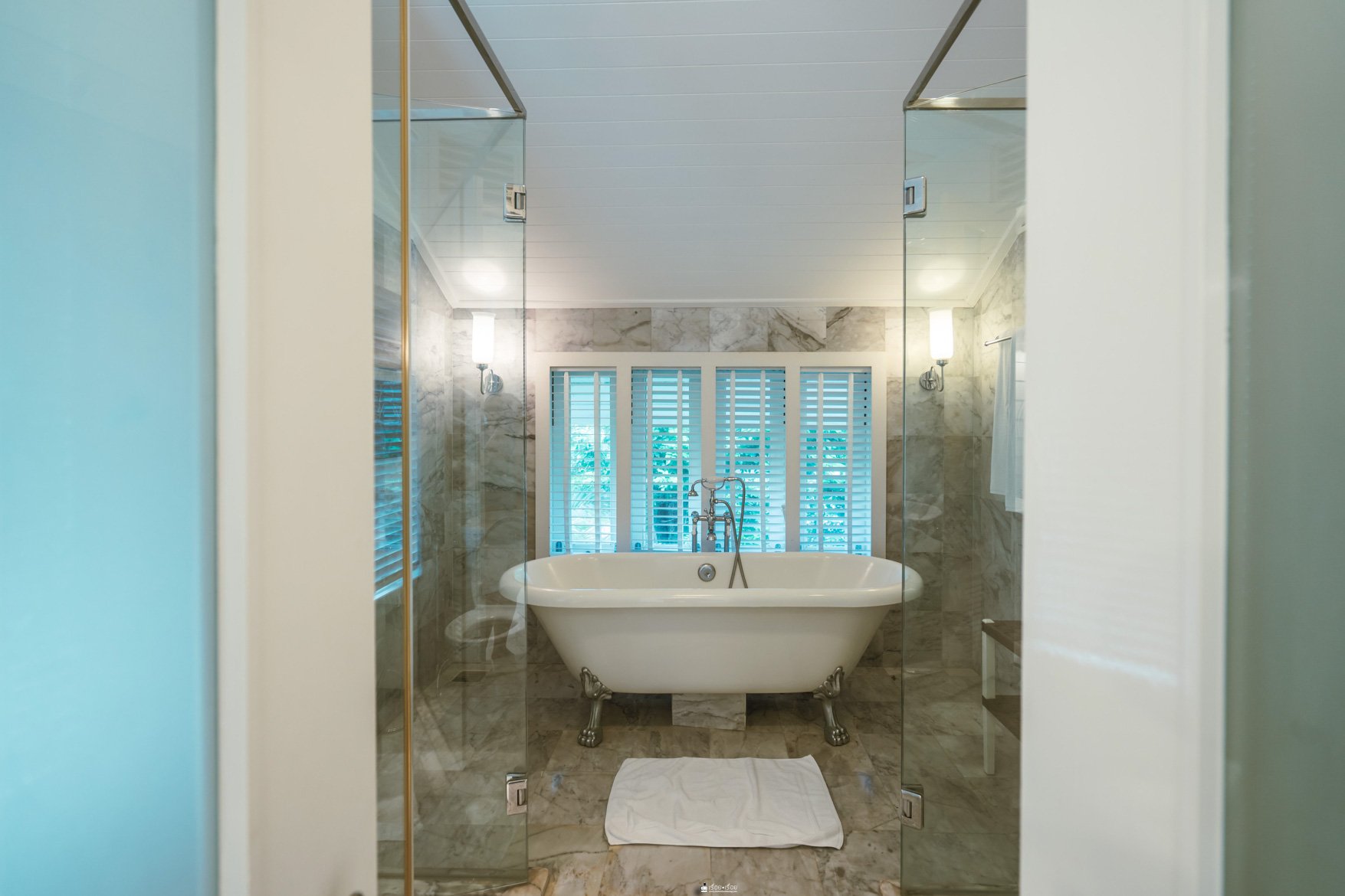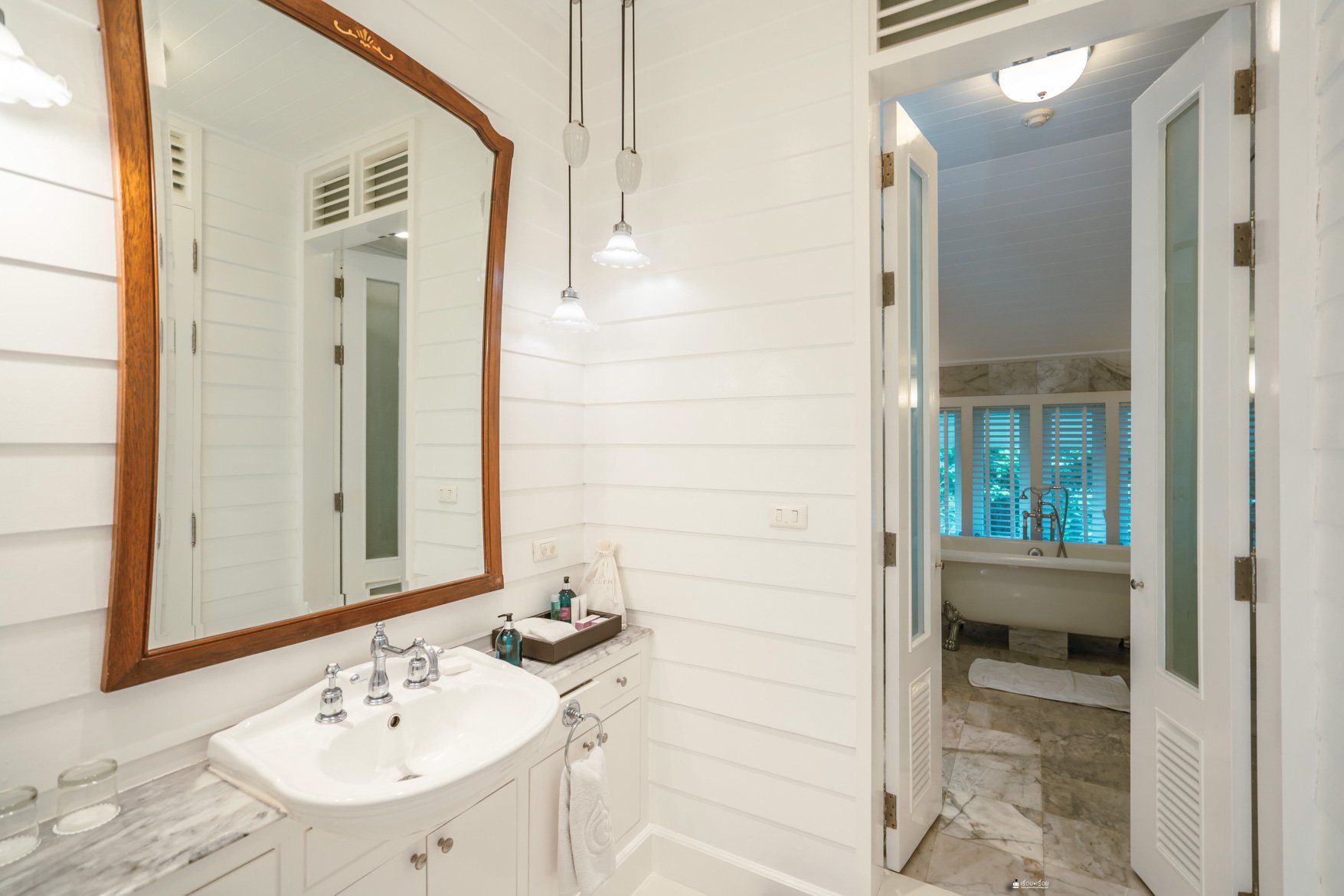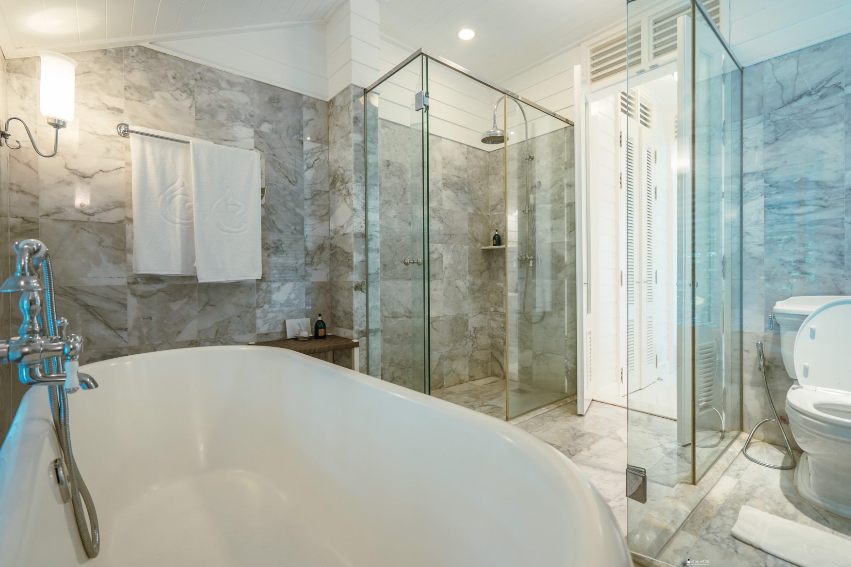 ห้องน้ำมีทั้งหมด 2 ห้อง หนึ่งห้องอยู่ด้านนอก และอีกหนึ่งห้องอยู่ภายในห้องนอนใหญ่ ตามที่เห็นในรูปนี้ ห้องน้ำมีขนาดกว้างและแบ่งเป็นสัดส่วนชัดเจน มีอ่างอาบน้ำสไตล์อังกฤษ (Bath Tub) ให้นอนแช่ตีฟองชิล ๆ โดยแยกออกจากห้องอาบน้ำ และห้องสุขา