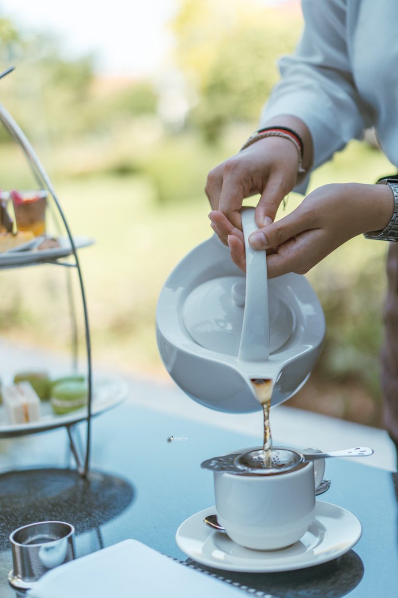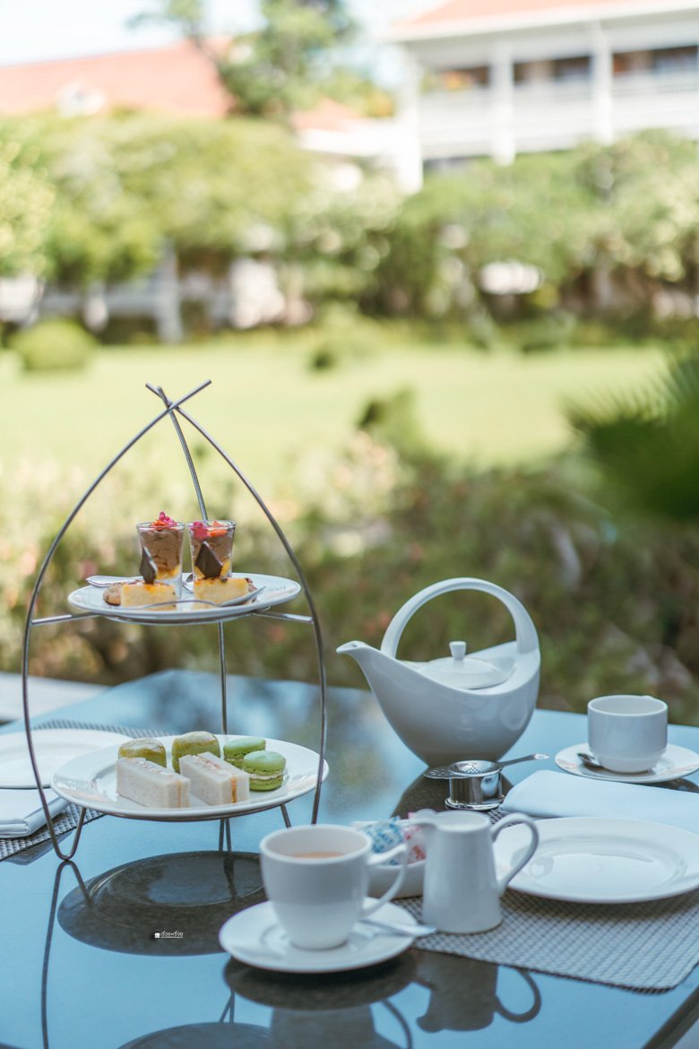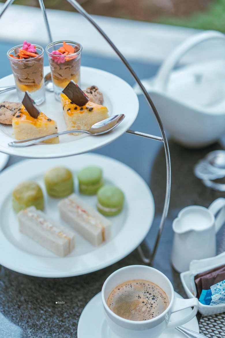 Set Afternoon Tea สามารถสั่งได้ในส่วนของเครื่องดื่ม ชา กาแฟ ยกเว้นเมนูที่มีแอลกอฮอล์ ขนมจะเป็น สโคนใบเตย (อร่อยมาก) มาการอง แซนวิสไข่ เค้ก และคุกกี้ ซึ่งในแต่ละวันเมนูอาจจะมีเปลี่ยนแปลง