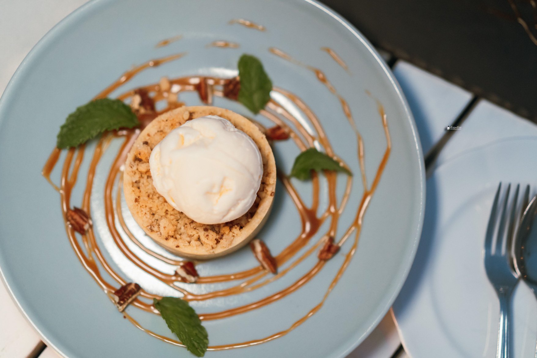 ตบท้ายด้วย 2 เมนูของหวาน แอปเปิล ครัมเบิล คู่ซอสครีมวานิลลา (Apple Crumble with Vanilla Sauce) ราคา 210++ บาท
